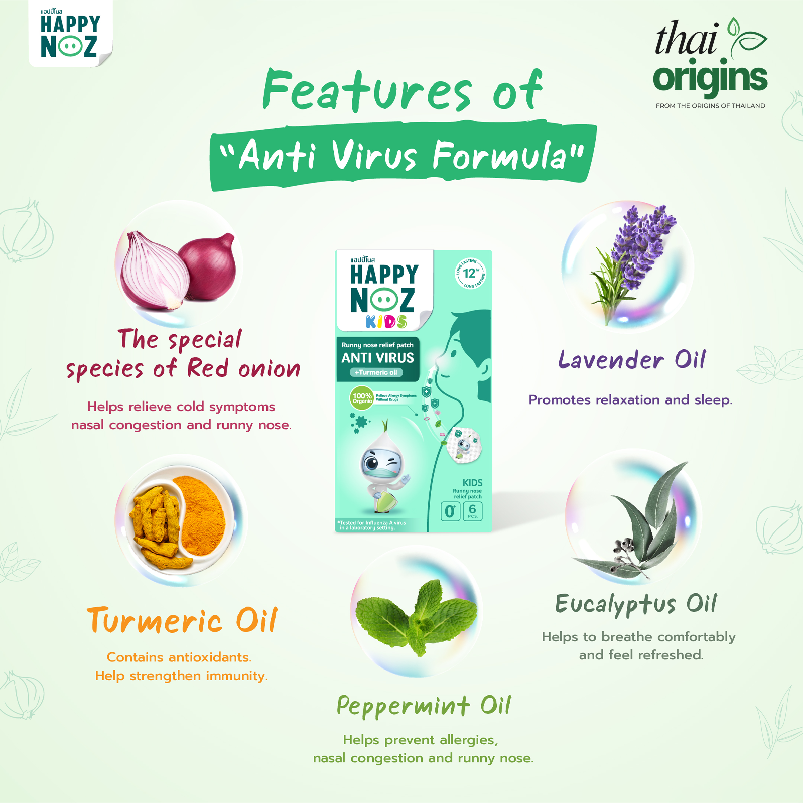 • Red Onion Oil — A special quercetin-rich variety that balances the immune system, reduces inflammation, and relieves nasal congestion, runny nose, and cold symptoms — forming the powerful organic base of every Happy Noz formula.